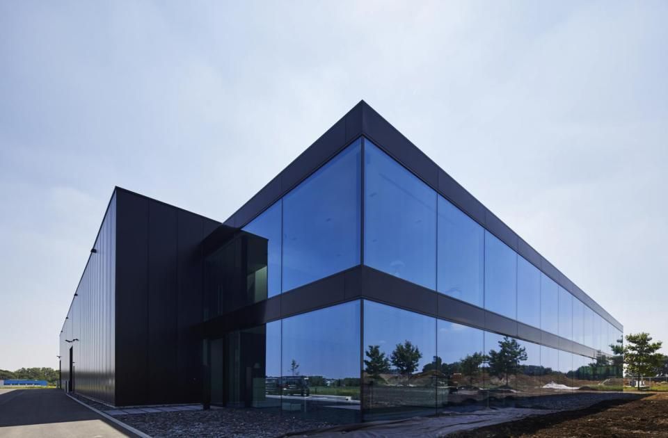 Le souhait du maître d’ouvrage était d’avoir un bâtiment assez sobre. L’extérieur est composé d’une structure métallique surmontée de panneaux sandwich qui font office à la fois de finition pour la façade et d’isolants. La toiture est composée de bacs en acier, d’isolation et d’une étanchéité. Trois des quatre façades des deux étages du bâtiment sont entièrement habillées de vitrages. Un vitrage solaire de grande dimension, pour respecter le souhait du maître d’ouvrage, placé en vitrine collée sans raidisseur.