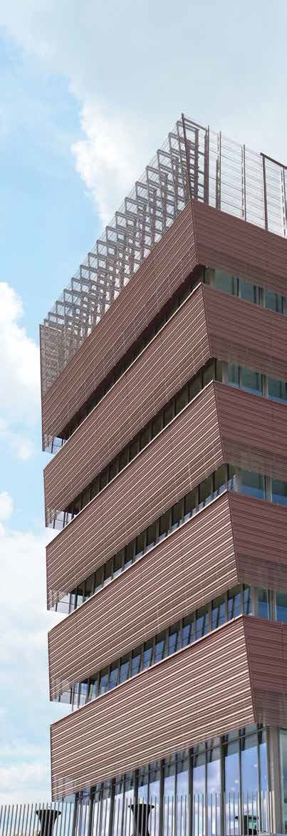 Les architectes en charge du projet ont choisi les solutions de bardage de façade de VMZINC. D’une part parce que VMZINC propose un vaste éventail d’aspects de surface et de teintes et d’autre part parce que VMZINC les ont incités à se montrer très créatifs avec les différentes possibilités de pose et techniques de zinc. Le bâtiment devant avant tout paraître vivant et dynamique, les architectes ont utilisé pour la majeure partie de la couverture de façade, du zinc plié, en alignement horizontal, au-dessus de la couche de construction inférieure, recouverte de dalles céramiques noires. Le service technique de VMZINC a d’ailleurs élaboré une technique de pliage spécifique sur mesure, en partant du VMZ Profil sinus. Cela a permis de marquer l’implantation rigide nord-sud du bâtiment et de susciter un effet de dynamique et de vitesse, ce qui donne nettement plus de caractère au bâtiment. En outre, la solution est bon marché car le zinc plié se place très facilement, sans joints.”