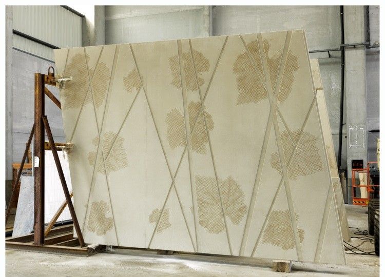 Dès le début, R²D² Architecture pensait reprendre via la technique « Graphic Concrete » l’impression en relief d’une représentation du bois et du végétal sur l’ensemble des façades. Le dessin initial était plus dense, avait une autre échelle et l’impression remplissait toute la surface du parement. Il s’agissait de deux images « modulaires », un dessin et son miroir qui se répétaient, tout en prévoyant une rotation de 90, 180 ou 270° de ces images de base pour créer un effet non répétitif.