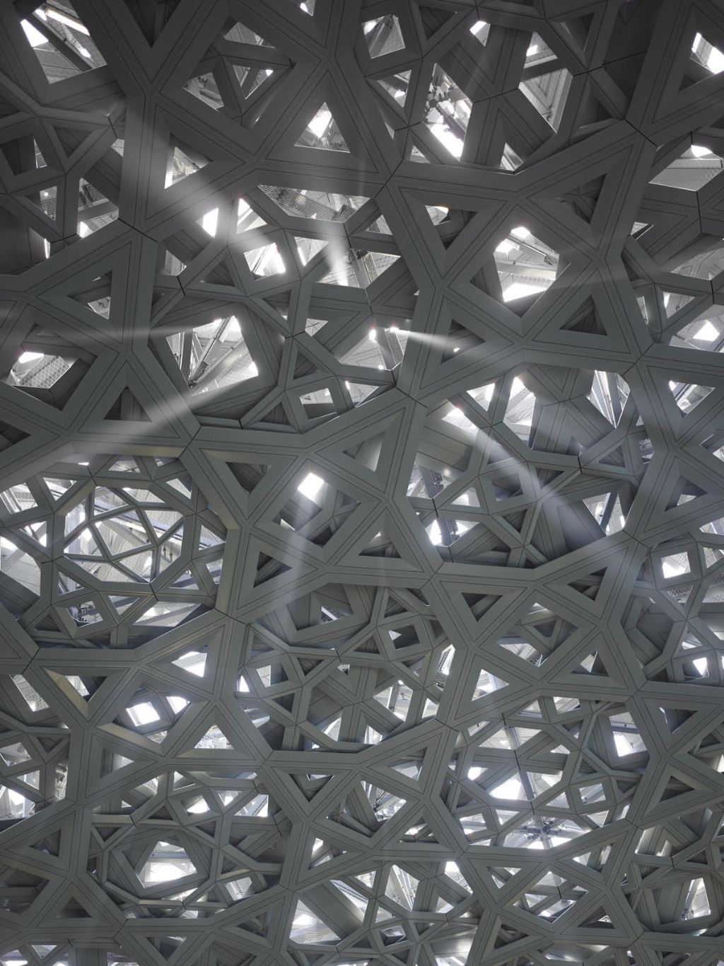 Inspiré par la culture architecturale arabe, le musée est recouvert d'un dôme de 180 mètres de diamètre constellé de 7850 étoiles en métal à travers lesquelles les rayons du soleil créent une «pluie de lumière» qui rappelle l’atmosphère des palmeraies et des souks. Ce plafond prodigue aussi bien une ombre bienvenue que des touches de lumières qui dotent l’ensemble d’une ambiance étonnante et participe à la mise en valeur des oeuvres. Chaque pièce est dotée d’une ambiance spécifique, en accord avec les œuvres qu’elle abrite. Des bassins, aménagés pour contenir la chaleur accentuent encore ce jeu d’ombre et de lumière.