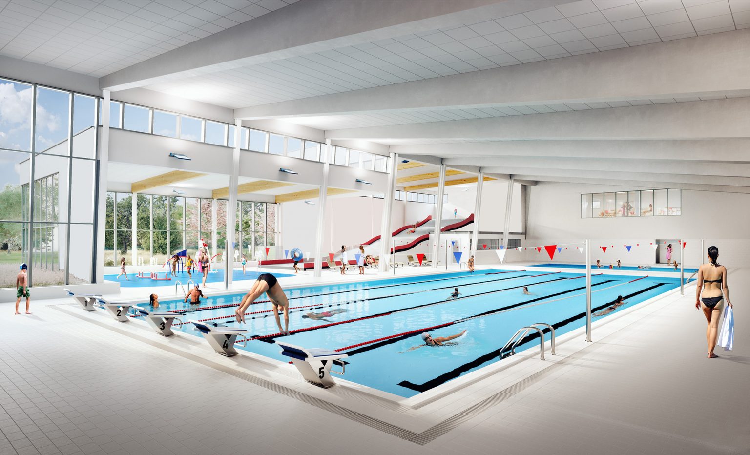 Le programme de la piscine existante est complété par un bassin sportif et une zone ludique, qui comprend une zone pour les jeunes enfants ainsi qu’une zone toboggan. Un espace fitness et wellness est également mis à disposition du public afin d’élargir l’offre proposée. Tout ceci est intégré au sein d’un volume simplifié qui se veut sobre et élégant.