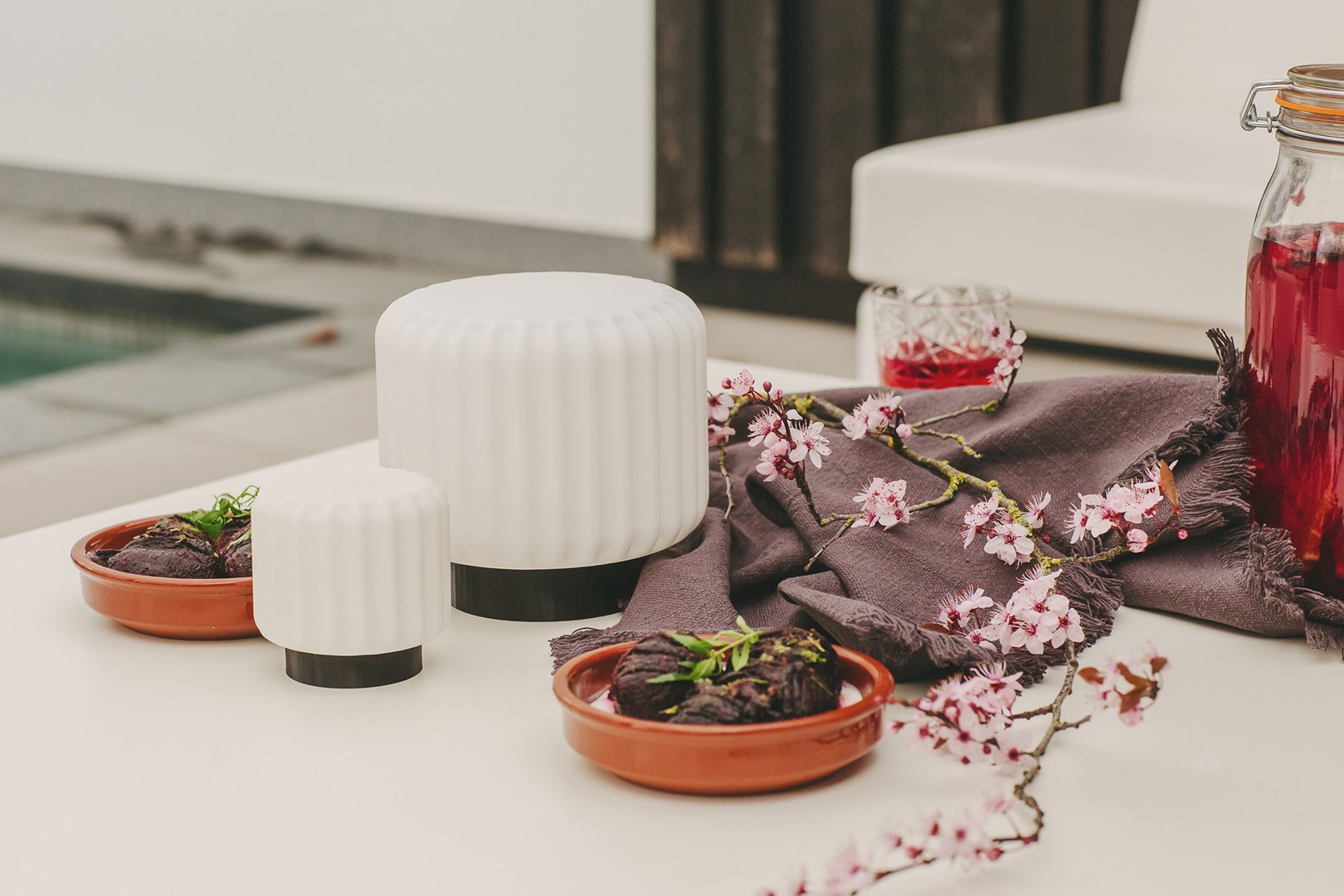 Les lampes Dentelles sont disponibles en trois tailles et formes différentes, toutes avec un corps de couleur crème. La base est un anneau magnétique en métal léger et existe en trois couleurs : noir, terra et or brossé. Sur les deux plus grandes versions, on peut même retirer l'anneau pour obtenir un look différent, simplement en le dévissant.
