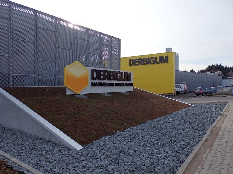 Au fil des années, Derbigum a grandi pour devenir un acteur mondial. Le groupe emploie 400 personnes à travers le monde et compte 4 unités de production, dont une à Lot, dans le Brabant flamand. Afin de consolider la croissance nationale et internationale, l’entreprise investit en permanence. Le site de Lot a donc été entièrement rénové, agrandi et modernisé pour servir d’unité de production efficace et de plate-forme internationale pour la distribution, la commercialisation et la vente des produits Derbigum. Le résultat est un site moderne qui emploie 58 employés et 23 ouvriers. La nouvelle façade en acier lisse garantit avant tout une cohérence entre les bâtiments administratifs et ceux de la production; elle offre aussi un look moderne sur la chaussée de Mons à Lot.