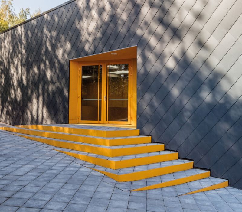 Des formes prononcées ont besoin des bons matériaux qui les mettront parfaitement en évidence. Les ardoises foncées offrent à la courbure atypique