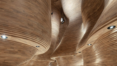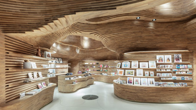 Le bureau australien Koichi Takada Architects a doté les deux boutiques de souvenirs du Musée National du Qatar à Doha - un musée conçu par Jean Nouvel - de surfaces en bois ondulées. L'aspect de grotte évoqué par ces surfaces est destiné à compléter la forme organique du bâtiment, inauguré en mars dernier.