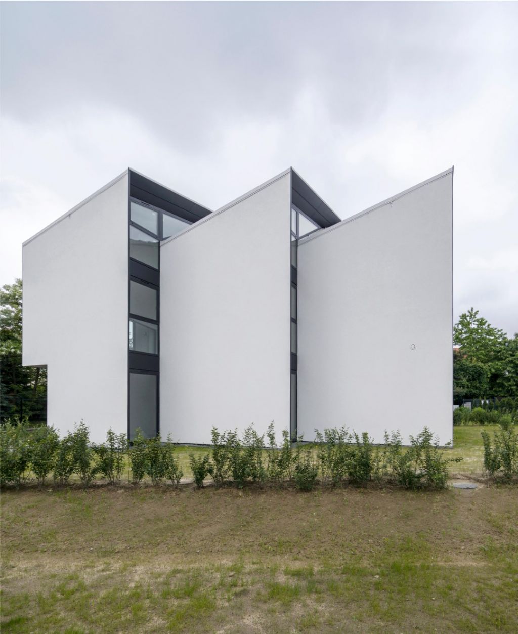 Nous ne sommes pas en bord de mer, mais au sud de la Pologne, dans le petit village de Zielonki, près de Cracovie. L'architecte Bartlomiej Drabik, du bureau Superhelix Pracownia Projektowa, a imaginé un ensemble de trois bâtiments atypiques, sur une parcelle centrale entourée de vis-à-vis. Atypiques par leur forme, leur uniformité de couleur et par l'espace vitré particulier qui les caractérise.