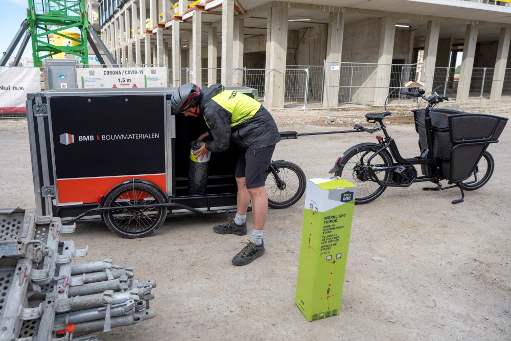 La toute première commande par coursier à vélo a eu lieu la semaine dernière, sur un chantier de construction à Nieuw Zuid de l'entrepreneur Hooyberghs, qui fait partie du groupe B&R Construction. "Nous avons fait ce choix très consciemment", déclare Hans T'jampens, responsable innovation chez B&R Bouwgroep. "Le secteur de la construction sera durable ou disparaîtra. Tous les acteurs de la chaîne devront contribuer à réduire notre consommation totale d'énergie. Nous devons y parvenir avec l'aide de nos fournisseurs. Les livraisons rapides à vélo de BMB Bouwmaterialen en sont un bon exemple. Utiliser aussi peu d'énergie et de matériaux que possible pour atteindre son objectif, c'est vraiment durable."