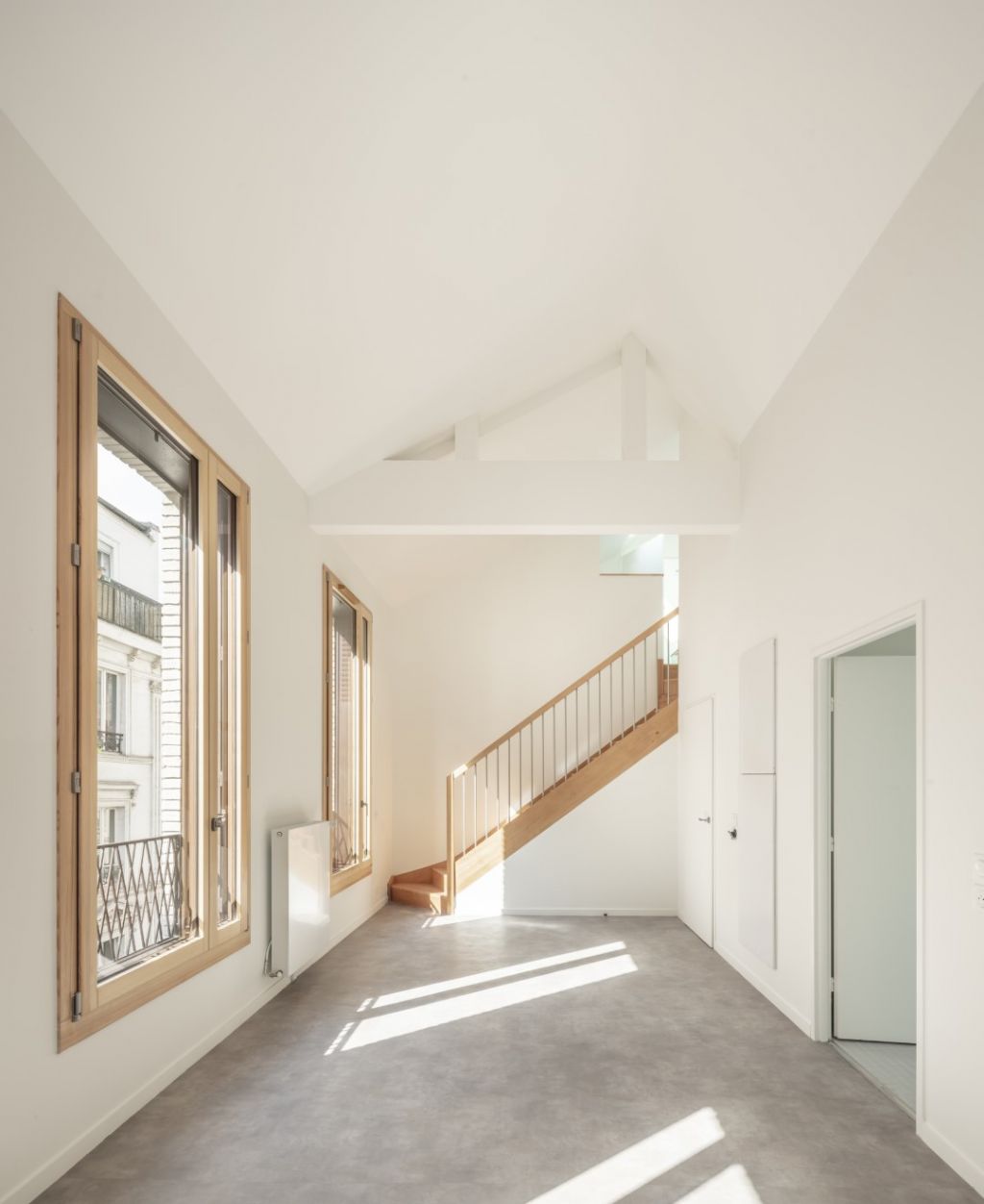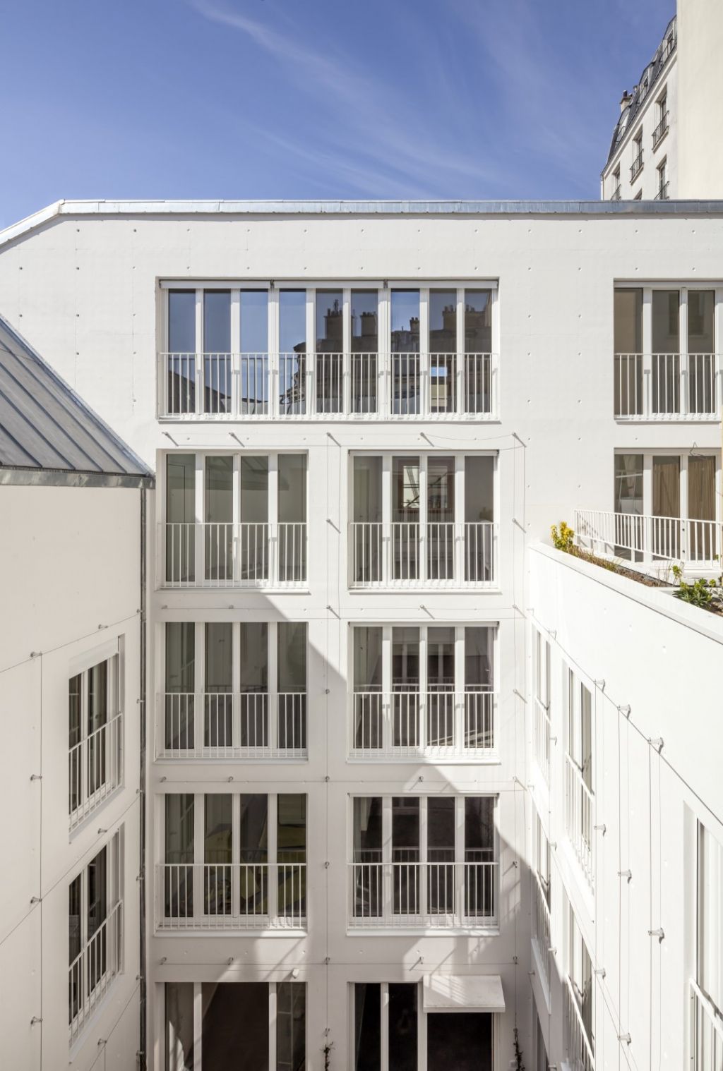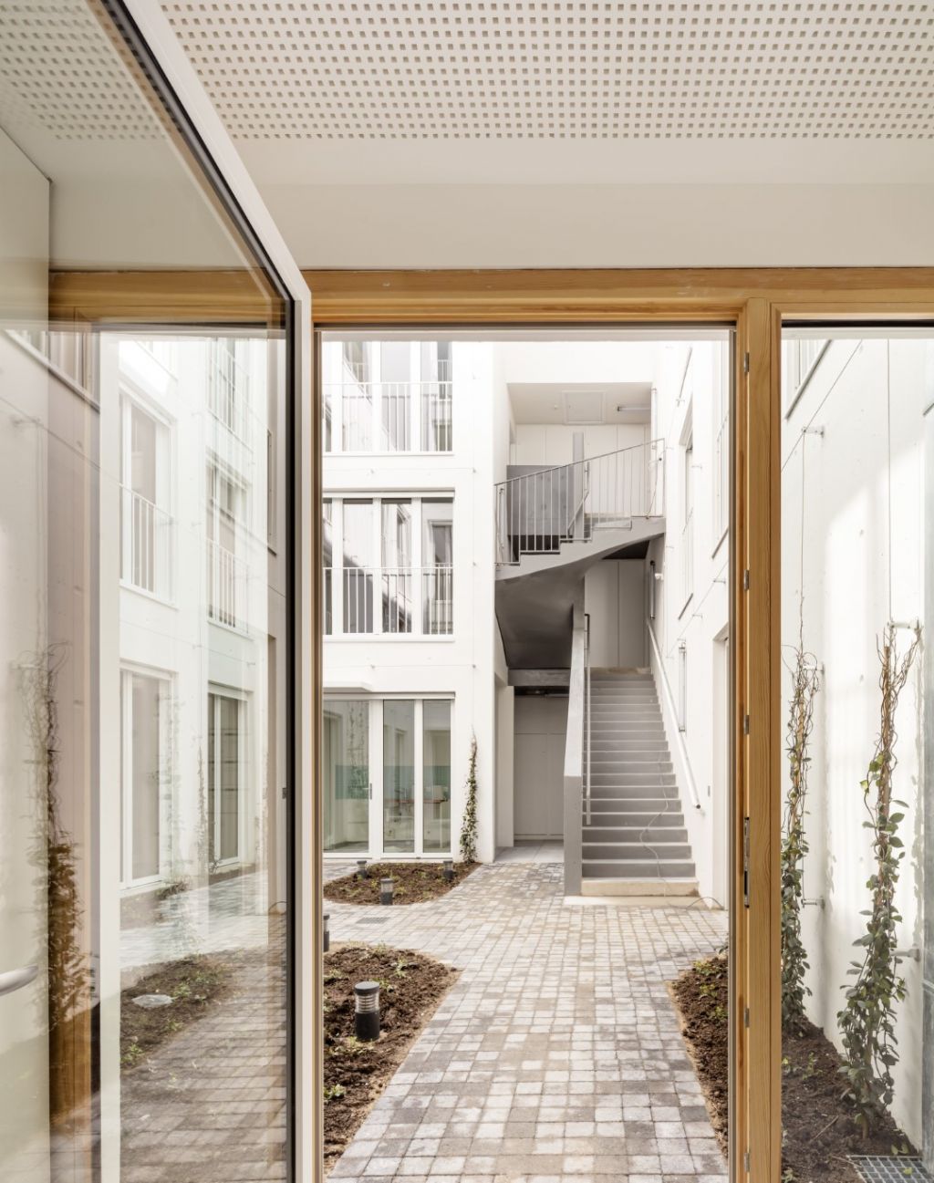 Ce dispositif de cour intérieure centrale permet aussi de créer un hall traversant, laissant apercevoir la cour depuis la rue. Cette cour est pavée et ses façades toutes blanches (béton peint, menuiseries bois-alu, garde-corps et stores) aux nombreuses fenêtres, rappelant celles des ateliers du 18e arrondissement, augmentent aussi la luminosité intérieure et accueillent des jasmins grimpants. De part et d’autre de la cour se trouvent l’escalier A qui offre de grands paliers où l’on peut imaginer des usages partagés entre voisins, et l’escalier extérieur B, qui tranche dans ce volume avec sa teinte grise.
