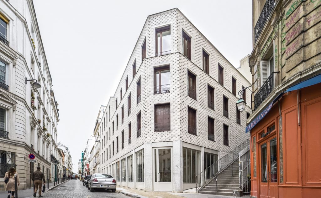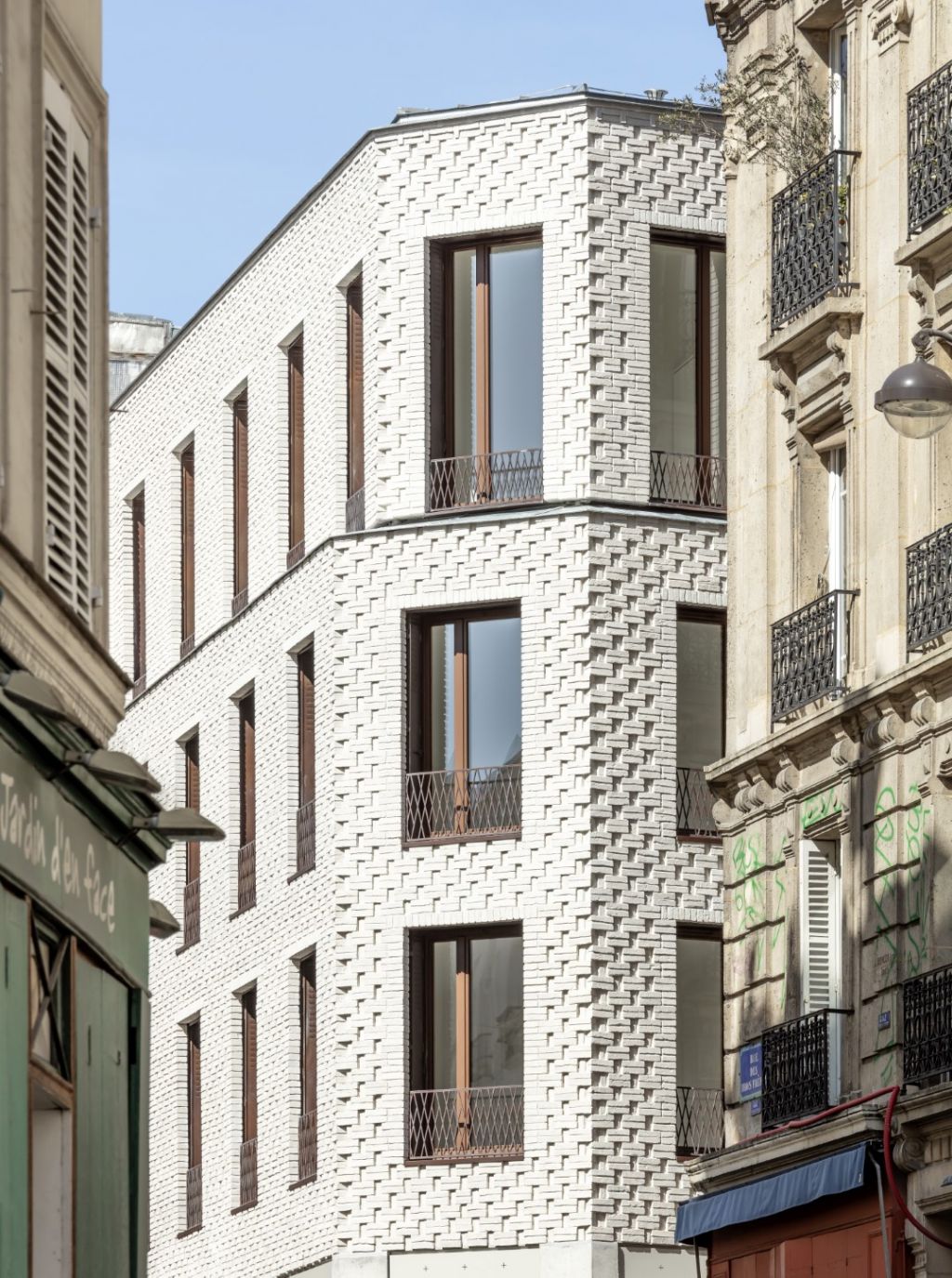 Sur une parcelle d'angle à Paris, Mobile Architectural Office a conçu des logements sociaux sobres, qui s'inscrivent parfaitement et discrètement dans un tissu urbain dense marqué par le relief escarpé de la Butte Montmartre. L'écriture contemporaine du projet se retrouve dans les volumes nets, les précadres soulignant l’épaisseur de la façade, ainsi que dans la brique blanche et sa modénature délicate qui dialoguent avec les ouvertures teinte rouille.