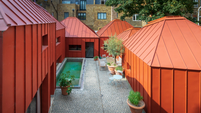 Les pavillons en tôle du projet \"Tin House\" de Henning Stummel Architects sont situés dans un quartier victorien de Londres. Chaque pavillon abrite une pièce. Les toits de forme pyramidale fournissent de l'espace, mais également beaucoup de lumière grâce aux fenêtres qui y sont intégrées.