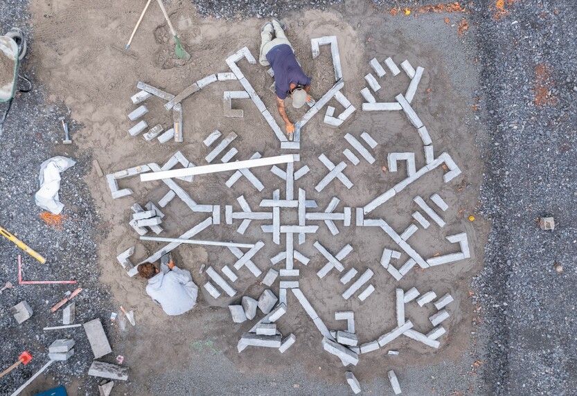 L'oeuvre se distingue ici par sa pratique du réemploi : 100 pierres bleues rectangulaires récupérées de la rue Royale d'avant les travaux (bordures de trottoirs et de parterres) ont été retravaillées pour l'occasion (près de 800 coupes réalisées), pour former des motifs décoratifs évoquant le monde floral et végétal sur un total de 70 m².