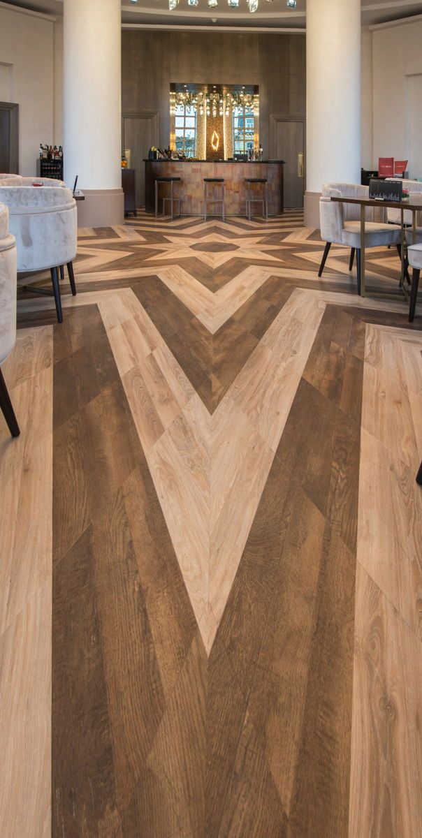 Dans la magnifique salle des fêtes, le choix s’est porté sur un sol Moduleo Moods unique et exclusif. Une création de l’équipe chargée du design de Moduleo, en concertation avec le designer londonien. « Nous avons utilisé ici le Chevron ou « point de Hongrie » de Moduleo Moods dans des couleurs personnalisées, sur la base de motifs existants, tels que Country Oak et Verdon Oak. La salle ovale a été divisée en 8 rayons. Depuis le centre de ces 8 parties, le Moods Chevron a été posé, sans dentelures. Les lames Moods Chevron ont ensuite été découpées aux endroits où elles dépassaient des rayons du cercle. À partir de la ligne centrale d’une partie suivante, elles coïncidaient parfaitement avec la partie précédente. Au milieu de la pièce, un grand octogone a été créé sur mesure », déclare Stefan Cnapelynck d’IVC Group. La mise en place fut un véritable exploit, réalisé par l’équipe d’installation sous la direction de Peter Jame et de la société DIJA Vloer- en Wanbekleding à Maaseik.
