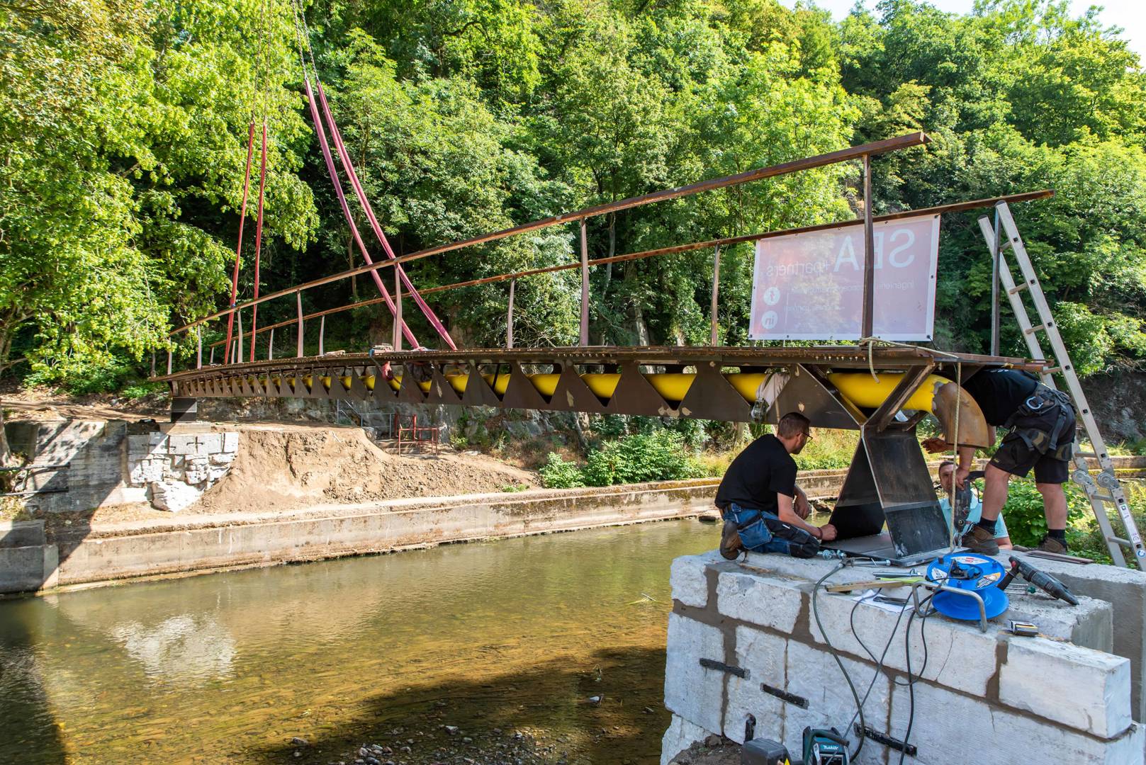 Emportée par la crue de juillet 2021, la passerelle a été reconstruite en s’appuyant sur les culées existantes restaurées. D’une portée principale de 21 mètres, elle intègre une conduite de gaz naturel de RESA dans une structure en acier auto-patinable de 3,8 tonnes, conçue comme une section ouverte en U perforée. Le projet associe fonction technique et usage public grâce à l’ajout d’un platelage en bois et d’escaliers d’accès, rétablissant une liaison intercommunale entre Verviers et Dison.
