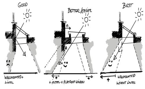 Le saviez-vous ? Les fenêtres à raccord murales (fenêtres inclinées contre un bâtiment principal) ne sont d'aucune utilité tant que l'on laisse le mur derrière ou le linteau. Ce linteau ou ce mur bloque la lumière du jour que l'on pourrait vouloir utiliser pour pénétrer dans l'espace plus sombre situé derrière le linteau. Les fenêtres à raccord murales ne sont donc d'aucune utilité si l'on n'enlève pas le linteau. Elles coûtent plus cher, impliquent plus de risques de placement (en raison de la planéité du raccord mural qui n'est pas toujours assurée).