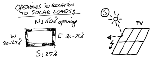 L'idée est de placer les ouvertures en tenant compte de l'ensoleillement de la façade. Pour une construction durable et Low-Tech, on peut prévoir 60 % d'ouvertures au nord, tandis qu'au sud, 20 % est plus souhaitable pour limiter la surchauffe. Les façades est et ouest étant également exposées au soleil, il serait préférable de n'avoir que 25 % d'ouvertures.
