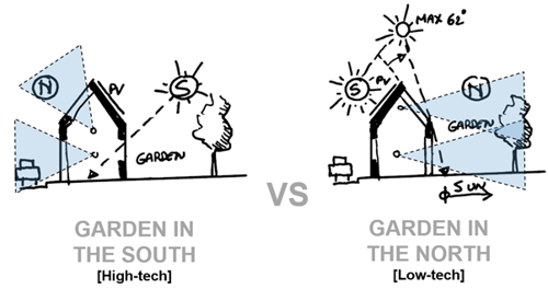 C'est pourquoi on dit que le sud est Hi-Tech : il nécessite plus d'accessoires et de technologie pour éviter l'éblouissement et la surchauffe. Le nord, en revanche, n'a pas besoin de cela et est donc considéré comme "Low-Tech".