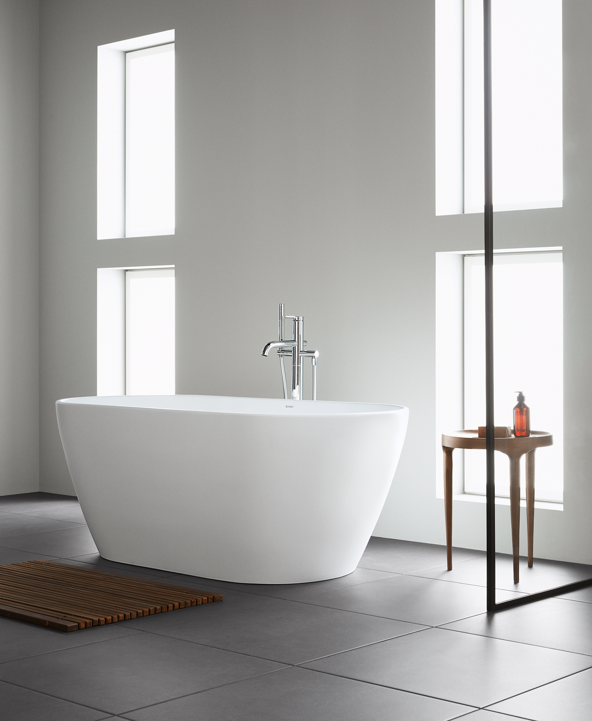 - Dans la gamme de prix adaptés aux projets, Duravit propose une série d’entrée de gamme design et peu coûteuses pour des agencements personnalisés de haute qualité, comme la baignoire à poser en îlot en DuraSolid® dans la série D-Neo.