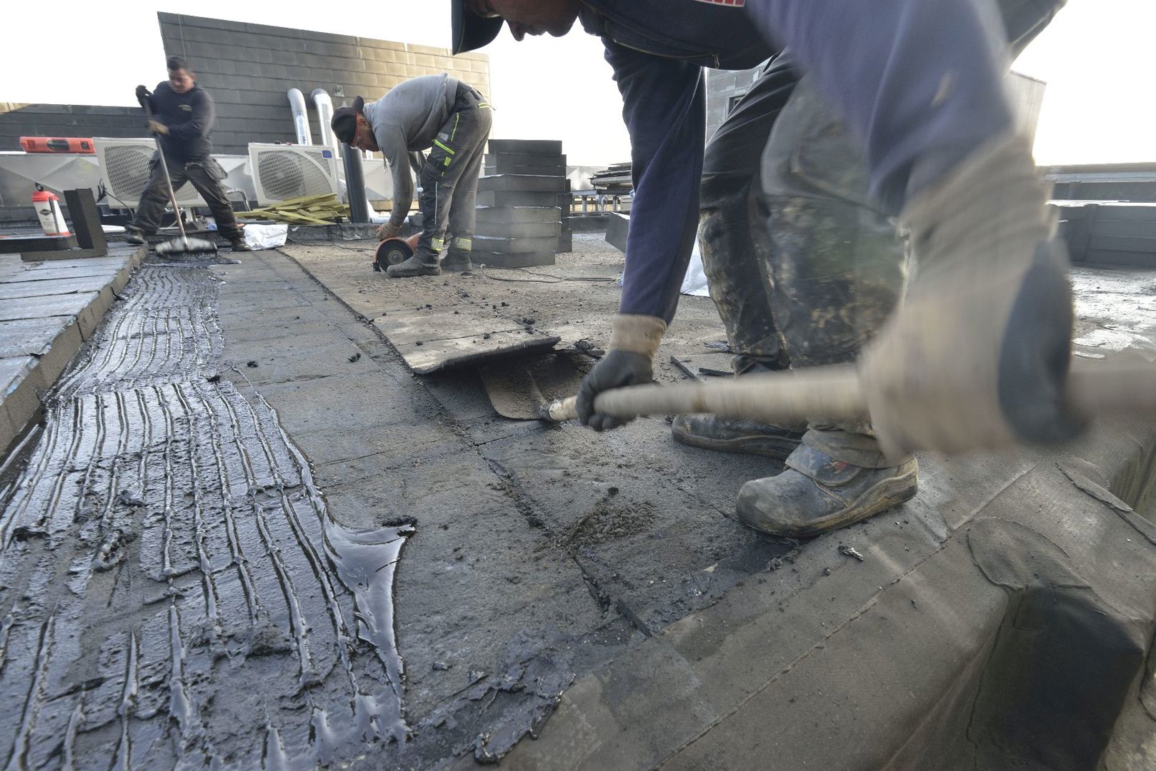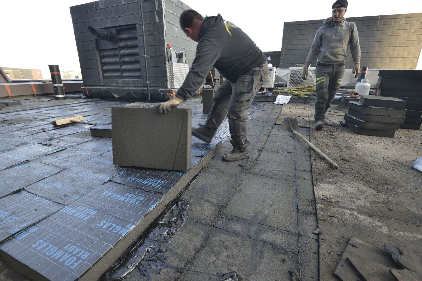 Après avoir enlevé la couche de graviers, l'ancienne membrane d’étanchéité a été pelée. Sur la couche de verre cellulaire existante, une couche supplémentaire de 10 cm de FOAMGLAS Ready Block T3+ est appliquée, suivie d'une nouvelle membrane d’étanchéité. Dans cette phase de la rénovation, la couche supplémentaire de verre cellulaire est appliquée avec PC800, une colle bitumineuse monocomposant prête à l'emploi, conditionnée en sacs pratiques de 25 kg. Les sacs présentent l'avantage de laisser beaucoup moins de colle dans l'emballage. En outre, les déchets résiduels sont moins importants que dans le cas des bidons métalliques ou en plastique. Autre avantage, le collage à froid ne dégage pas d'odeur, contrairement au bitume chaud, et de permettre aux couvreurs de travailler plus rapidement et en toute sécurité.