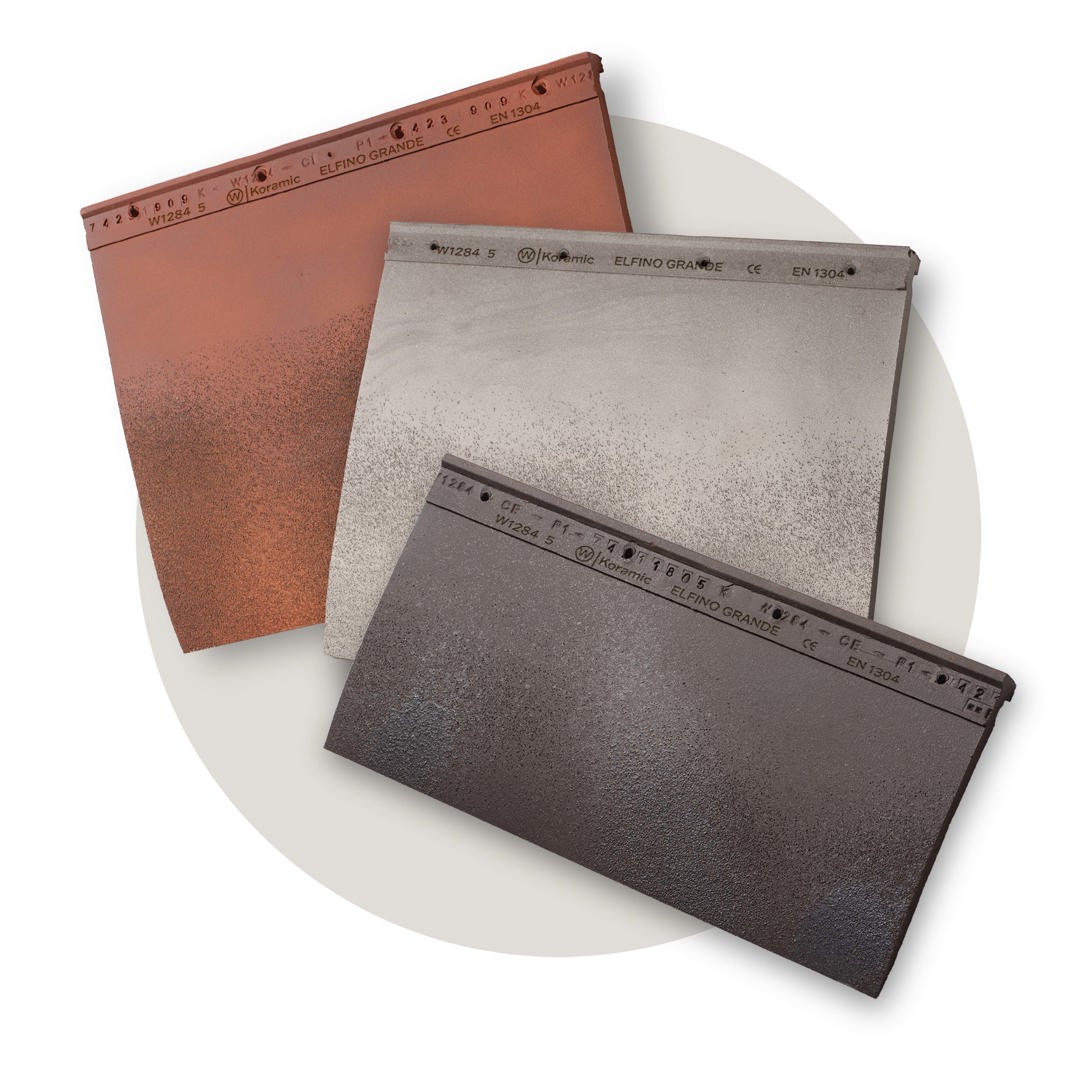 La tuile en céramique est disponible en deux versions : la tuile Elfino Grande (18,4 pièces/m²), conçue pour les toitures et les façades, et la tuile raccourdie Elfino Grande (28,6 pièces/m²), uniquement prévue pour les façades. Les deux variantes sont disponibles en trois teintes : gris clair, rouge rouille et brun foncé. Chaque variante de couleur présente des nuances subtiles qui créent un effet vibrant et naturel, ce qui permet à la tuile de se fondre harmonieusement dans divers styles architecturaux. En choisissant la même teinte pour le toit et la façade, on obtient de surcroît un effet homogène et un look épuré qui souligne la forme du bâtiment.