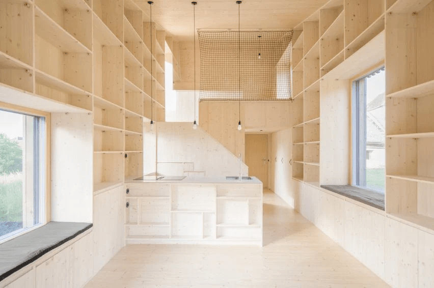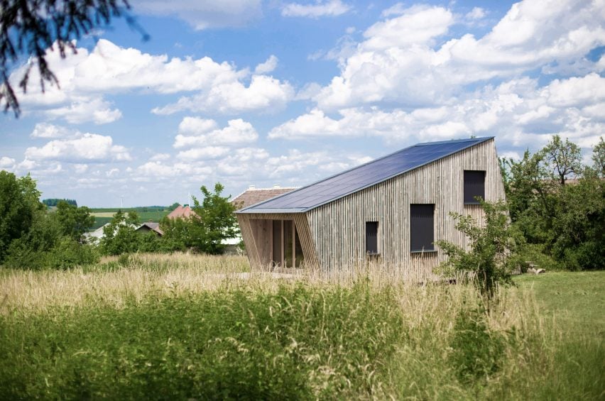 « La maison est surélevée et ne touche le terrain que par ses huit fondations vissées, ce qui signifie qu'aucune surface du sol n'est scellée », explique les architectes. « La plupart des matériaux utilisés proviennent des alentours », ajoutent-ils. « Le bois, tant pour les éléments structurels que pour les surfaces, provient des hectares de forêts appartenant au client et a été transformé dans la scierie voisine »