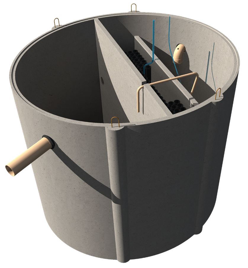 JAN LAUWERS : « Dans les zones périphériques, où aucune épuration collective des eaux n’est installée, on peut recourir à deux systèmes différents de traitement des eaux usées domestiques. Il existe d’une part les installations individuelles, ou IEI en abrégé, qui collectent les eaux usées principalement des habitations privées. Si par contre le bâtiment rejette un volume plus important d’eaux usées domestiques, comme c’est le cas des grands projets résidentiels ou des immeubles de bureaux, on adopte alors une microstation d’épuration, ou SEI. Nous nous situons ici à une échelle bien différente de celle du réseau d’égouts. Alors que pour les gestionnaires de réseaux d’égouts, un système de traitement des eaux de 500 EH (équivalent habitant) représente plutôt un petit système, une microstation d’épuration équivalente constitue par contre une grande installation pour les fabricants de produits en béton. L’EH des SEI est généralement compris entre 20 et 100. Mais le principe de fonctionnement de ces systèmes est similaire. »