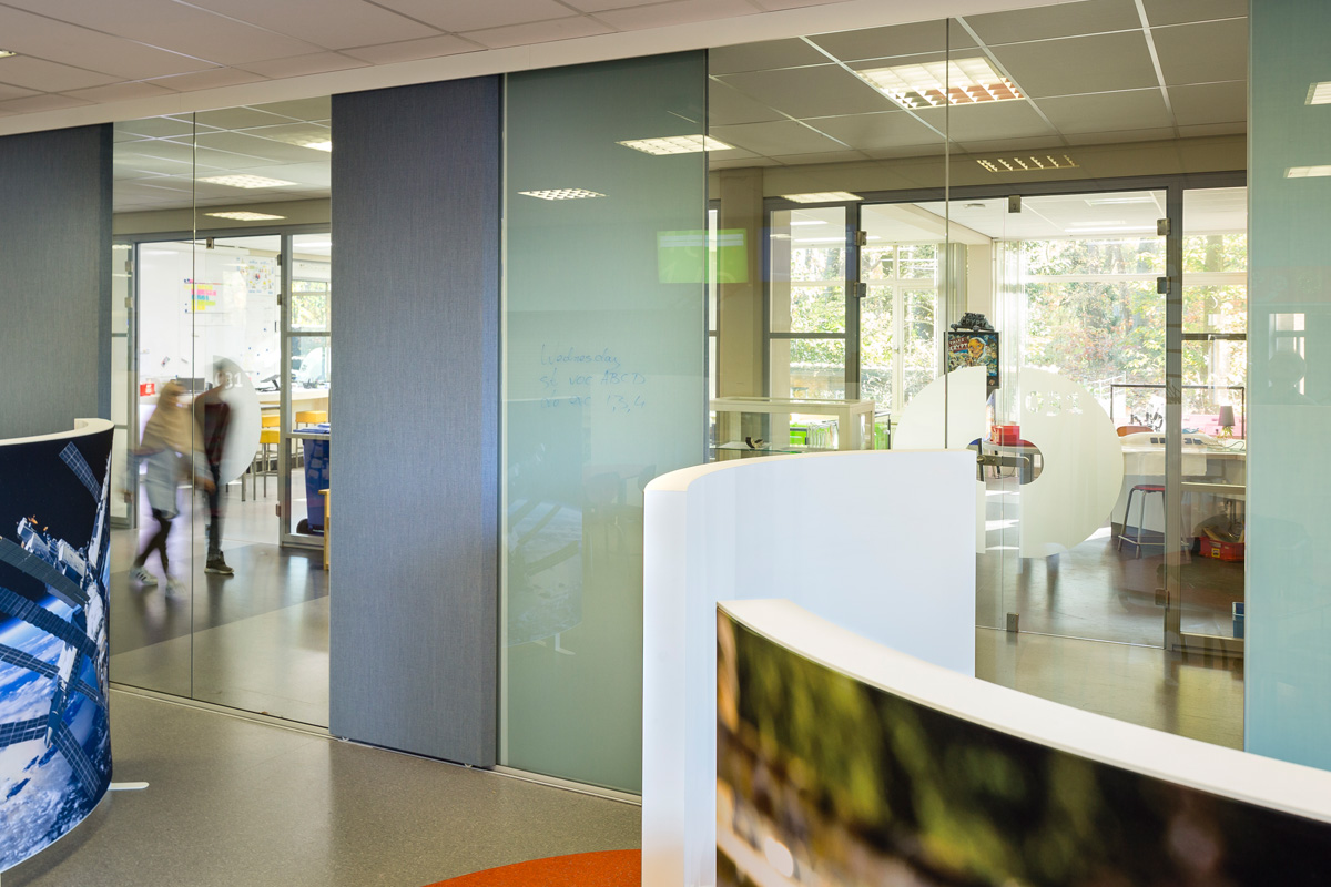 Ce concept modulaire unique a été conçu pour fournir des espaces de bureau avec des aménagements temporaires, avec une absorption acoustique supplémentaire et, si nécessaire, le respect de la confidentialité. Faisant partie d'un innovant système de mur de verre acoustique modulable, ce panneau coulissant acoustique possède un très haut coefficient d'absorption acoustique et un coefficient d'isolation acoustique de 37 à 39 dB. Ce panneau se déplace sur un rail situé dans le plancher tout en étant guidé par un rail supérieur. Il est facile à assembler ou à déplacer et est toujours adapté au mur. Le panneau est également simple à (re)tapisser, il peut ainsi changer d'apparence et vivre plusieurs vies.