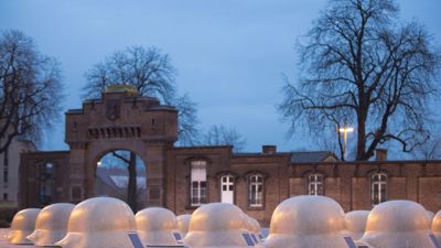 L’architecte Bart Lens, concepteur des casques : « Ces casques symbolisent les longues et douloureuses années de l’occupation allemande. Ils font référence aux casques en acier portés par les soldats allemands lors de l’invasion de la Belgique. Certains passants ont été choqués, mais nous voulions montrer cette menace ».