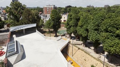 Extension d’une crèche existante de 38 à 82 enfants, située sur un site scolaire avec zone intérieure verte au coeur d’un tissu urbain dense. Pas une sinécure étant donné qu’un tel programme d’extension est de nature à avoir un impact immense sur l’espace libre du site scolaire. Le choix s’est porté sur une grande extension en sous-sol qui vient se raccorder au jardin en contrebas. En concevant l’extension semi-enterrée, l’impact est minimal et le toit peut devenir une plaine de jeu aventureuse. L’extension héberge 4 groupes d’âges reliés entre eux par une ruelle intérieure de jeu formant un méandre. Chaque espace ouvre sur un espace extérieur avec talus qui fait la liaison avec la plaine de jeu.