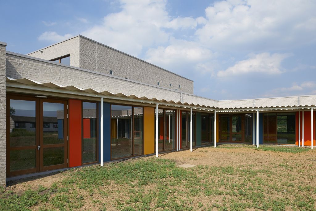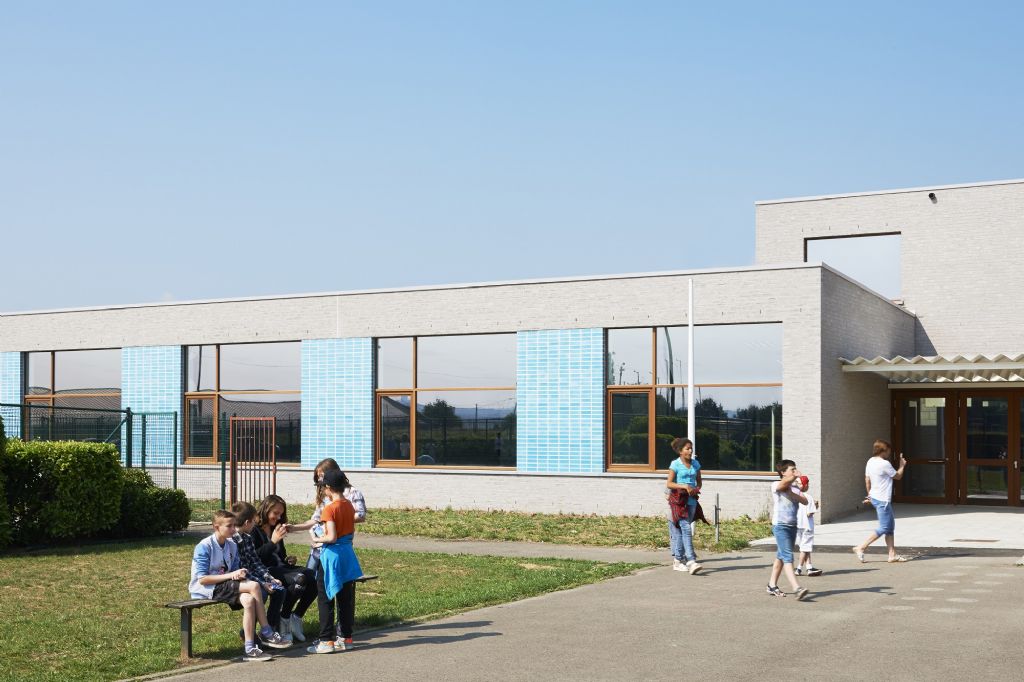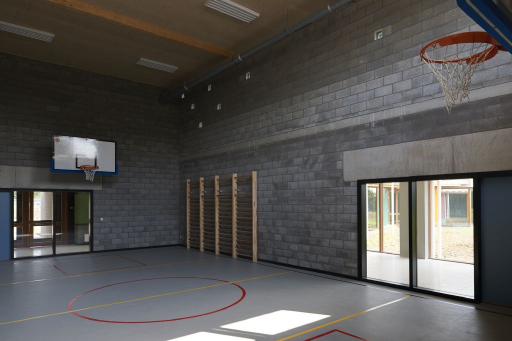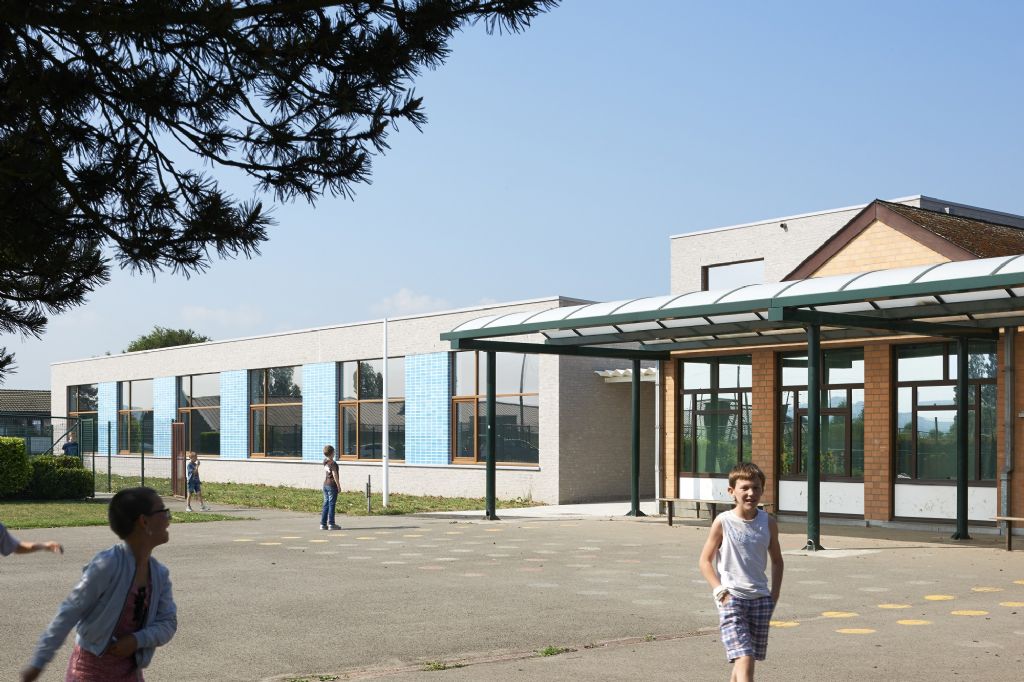 A l’échelle du site, l’école fondamentale se trouve à l’entrée du site. La nouvelle entité formée s’étire horizontalement sur un axe nord-sud, vers le secondaire et se ramifie selon un axe secondaire Est-Ouest. L’école est remodelée, (re)ancrée au site qu’elle colonise, se mettant en sympathie avec le paysage qui l’entoure. Malgré une typologie de plain-pied inhérente à la fonction d’école spéciale et un facteur de forme relativement défavorable, les valeurs Ew de 65 KWh/m²/an et K24 sont atteinte pour l’extension. Les parements extérieurs sont majoritairement composés de maçonneries de brique - teinte grise avec joints beurrés, à l’exception des façades vers jardin, présentant un ensemble de menuiserie bardé de tôles en acier laqué dans une gamme de quatre couleurs. Les auvents, couvrant l’entrée principale et la façade vers jardin sont, quant à eux, en acier laqué blanc. Les menuiseries extérieures sont réalisées en afzélia. À l’intérieur, dans un soucis de longévité, les murs des classes, de la salle de sport et des circulations sont laissés en blocs apparents. Seules quelques zones choisies sont enduites en blanc pour optimiser l’apport de lumière naturelle. Les entrées des classes sont également traitées de manière différenciée, profitant de tôles d’affichage en acier laqués et de menuiseries peintes. Les revêtements de sol choisi sont le carrelage granito pour les circulations, le linoléum pour les classes et les bureaux ainsi qu’un caoutchouc acoustique pour la salle de sport.