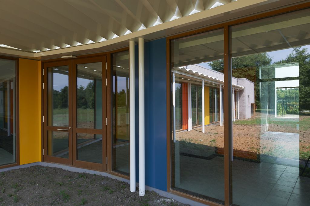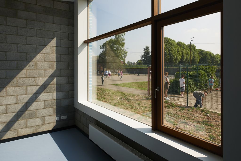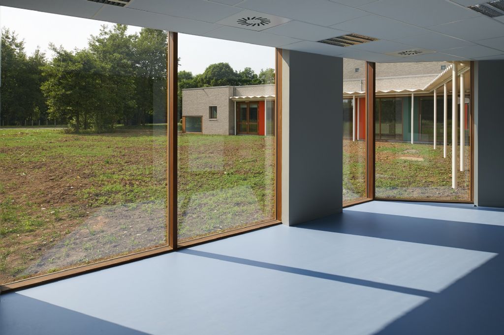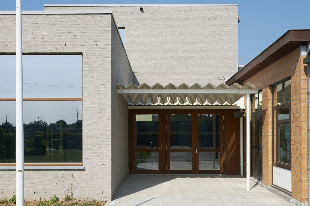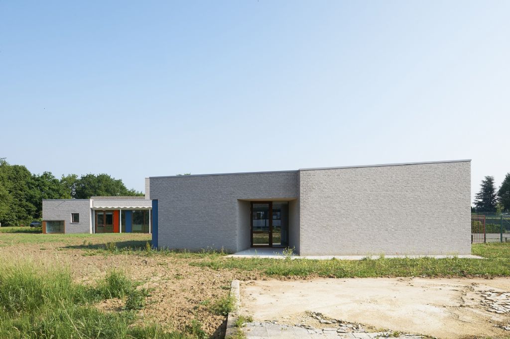 A l’échelle du site, l’école fondamentale se trouve à l’entrée du site. La nouvelle entité formée s’étire horizontalement sur un axe nord-sud, vers le secondaire et se ramifie selon un axe secondaire Est-Ouest. L’école est remodelée, (re)ancrée au site qu’elle colonise, se mettant en sympathie avec le paysage qui l’entoure. Malgré une typologie de plain-pied inhérente à la fonction d’école spéciale et un facteur de forme relativement défavorable, les valeurs Ew de 65 KWh/m²/an et K24 sont atteinte pour l’extension. Les parements extérieurs sont majoritairement composés de maçonneries de brique - teinte grise avec joints beurrés, à l’exception des façades vers jardin, présentant un ensemble de menuiserie bardé de tôles en acier laqué dans une gamme de quatre couleurs. Les auvents, couvrant l’entrée principale et la façade vers jardin sont, quant à eux, en acier laqué blanc. Les menuiseries extérieures sont réalisées en afzélia. À l’intérieur, dans un soucis de longévité, les murs des classes, de la salle de sport et des circulations sont laissés en blocs apparents. Seules quelques zones choisies sont enduites en blanc pour optimiser l’apport de lumière naturelle. Les entrées des classes sont également traitées de manière différenciée, profitant de tôles d’affichage en acier laqués et de menuiseries peintes. Les revêtements de sol choisi sont le carrelage granito pour les circulations, le linoléum pour les classes et les bureaux ainsi qu’un caoutchouc acoustique pour la salle de sport.