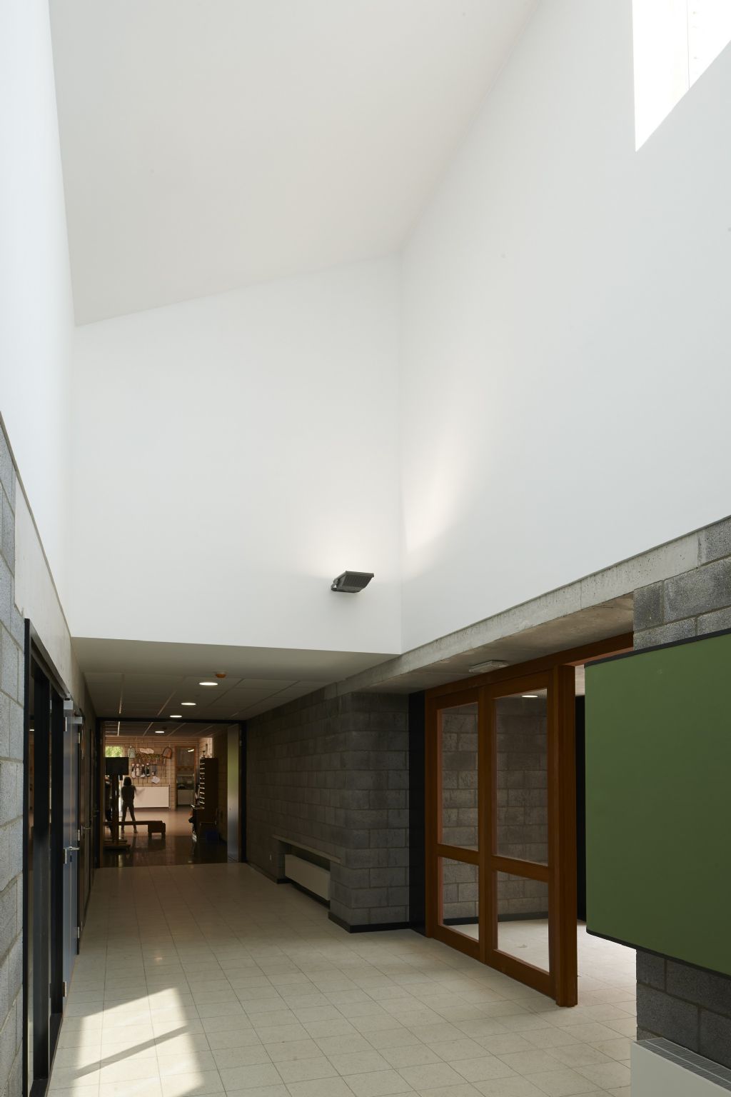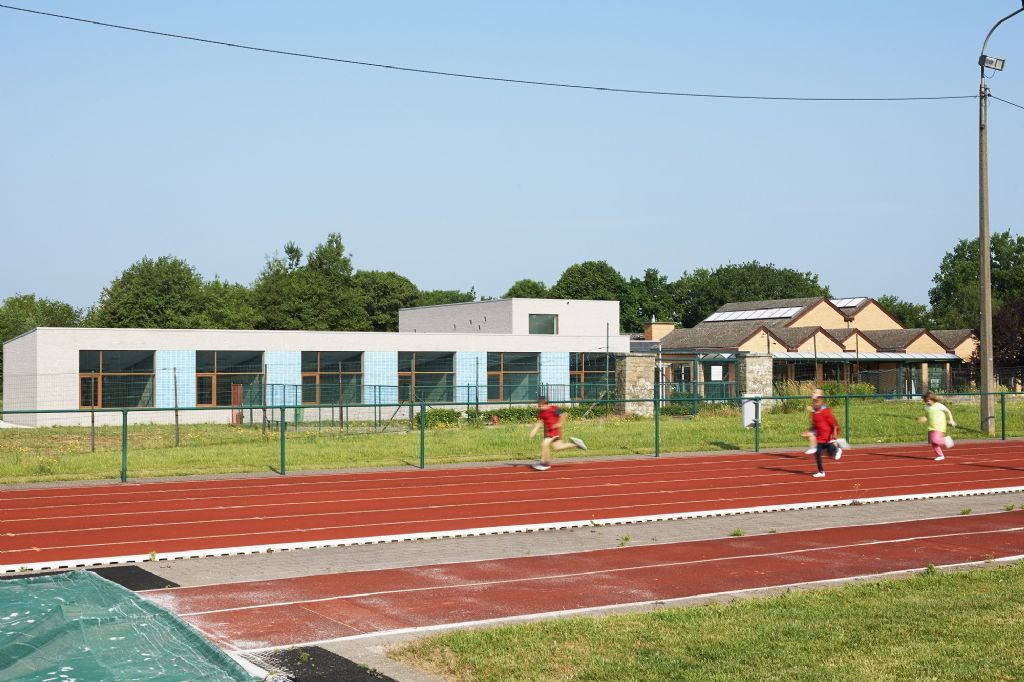L’entrée principale des élèves est déplacée au cœur du dispositif, entre les deux entités, à la jonction entre l’école existante et l’extension. Le nouvel ensemble s’articule autour du volume haut abritant la salle de gymnastique ; ce volume répondant en contre point au volume de l’atrium existant. Les deux espaces « communautaires » de la composition affichant ainsi la singularité de leur fonction, sans être en conflit d’intérêt. La circulation à l’intérieur se veut simple et claire, gage de sécurité et de facilité d’utilisation pour les enfants. Un premier axe nord/sud relie l’atrium, la salle de gym, le réfectoire et les classes. Son prolongement, vers l’extérieur, donne sur le réfectoire des repas chauds. Un second axe nord/sud, plus court, prolonge l’aile existante abritant la direction et les locaux paramédicaux. Ces deux axes sont en relation via le bâtiment existant mais aussi via le réfectoire venant ainsi réaliser une «boucle» spaciale pour une liberté de circulation optimale.