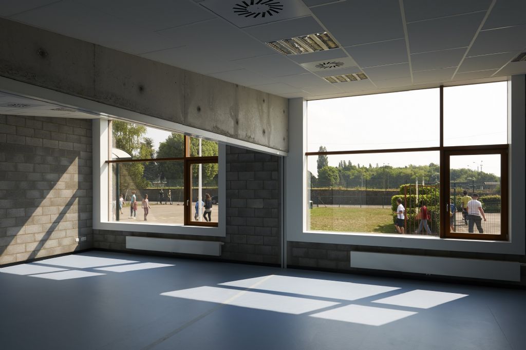 Plutôt que de générer une organisation bicéphale, les architectes ont choisi de légèrement glisser le centre de gravité de l’école existante et de le renforcer en accolant les fonctions communautaires du programme de l’extension à l’atrium existant. Une distribution simple traversant l’ensemble de l’école est ainsi créée. En parallèle, le prolongement de l’aile administrative et paramédicale est réalisé. L’implantation a été choisie parce qu’elle ouvre la voie à différents schémas de développement futurs pour l’école, sans jamais hypothéquer les fondements, la proposition réalisée. Que du contraire, puisque cet accolement à l’existant permet diverses économies du fait de la réduction des circulations, du regroupement des locaux techniques, de la suppression de la façade nord de l’extension et donc de la réduction du volume de déperdition. D’autre part, l’intervention sur le bâtiment existant met à profit des m² existants en les réaffectant ou en en optimisant l’organisation à moindre frais.
