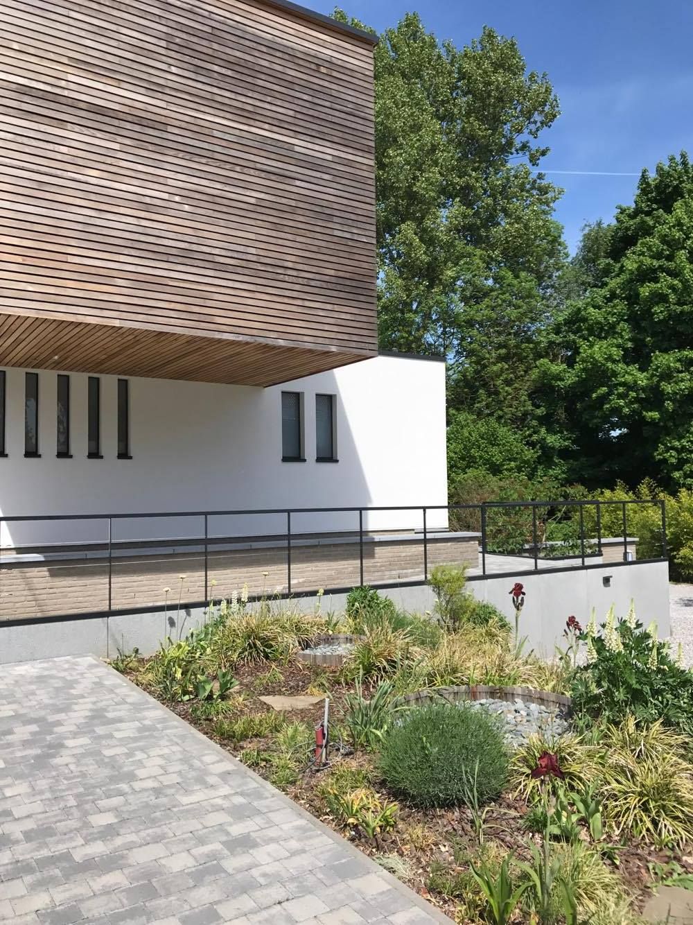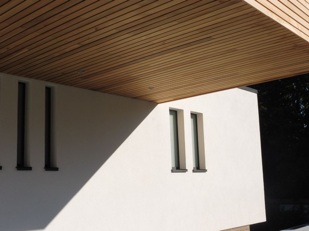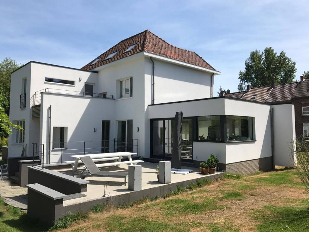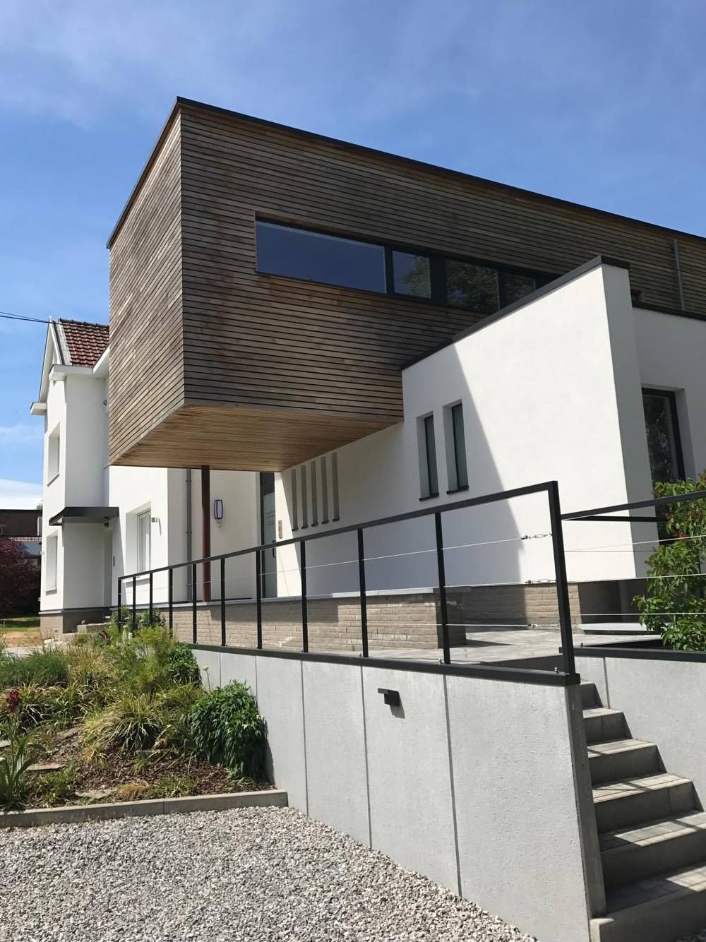 Différentes étapes ont guidé l’élaboration du projet. Premièrement, les extensions ont été visuellement détachées de la maison existante par le biais de failles vitrées. Celles-ci renforcent ainsi l’identité propre de l’habitation existante. Deuxièmement, les deux extensions latérales s’unifient par la réalisation d’un mur de façade continu les connectant visuellement de chaque côté de la maison. Au travers de ce mur, des baies de type meurtrières ont été imaginées afin de conserver l’intimité de l’intérieur de la maison depuis la rue. A l’arrière, les volumes s’ouvrent entièrement vers le jardin de par la multitude de baies vitrées variées, dynamisant la façade. Troisièmement, afin d’identifier la transformation, un parallélépipède rectangle en bois, a été posé à l’étage. Ce volume agit tel un marquage temporel et un appel visuel. Il constitue un geste architectural qui marie deux époques entres-elles. Enfin, l’ensemble des constructions (neuves et existantes) ont été unifiées par la réalisation d’un parement de ton blanc et d’un soubassement en briques. Ce dernier est continu sur les façades et se prolonge à certains endroits en tant que mur d’abords ou de soutènement.