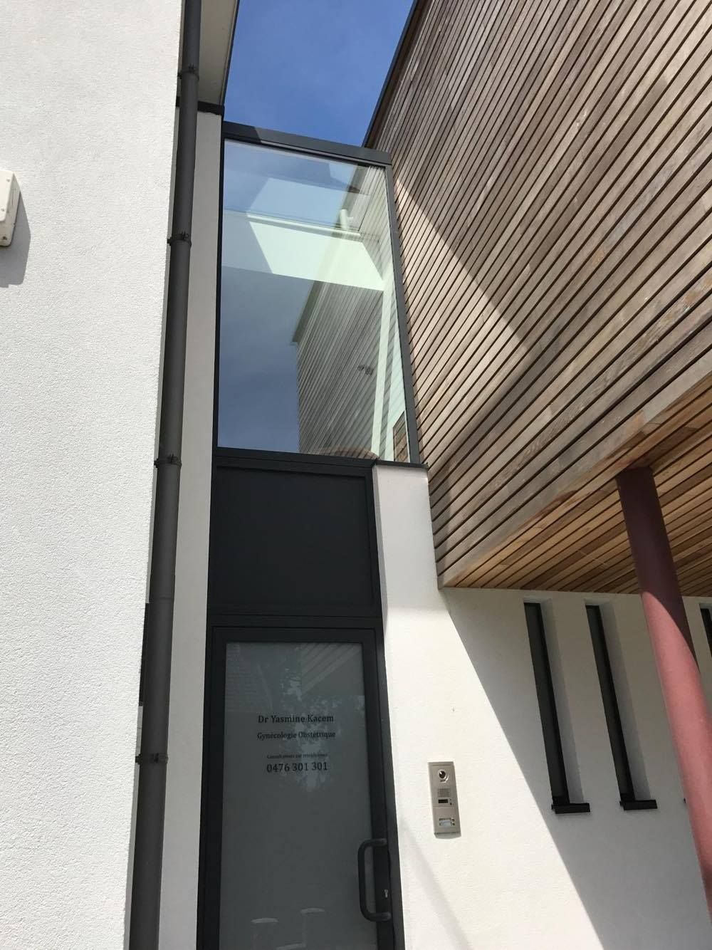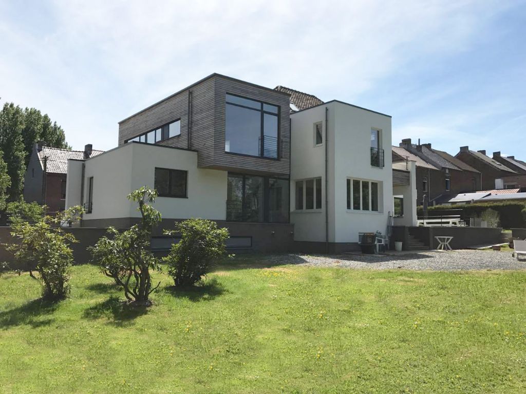 D’un point de vue énergétique, le projet a été complètement pensé afin d’obtenir une habitation de type basse énergie. La maison existante a été entièrement isolée et les techniques spéciales ont été entièrement remplacées (ventilation avec récupération de chaleur, chaudière à condensation au gaz, etc. ...). D’un point de vue planimétrique, l’extension « cuisine » a été réalisée sur la partie gauche de la maison, en relation directe avec la salle-à-manger agrandie au profit de l’ancienne cuisine démontée. L’extension « chambre » a été réalisée à l’arrière de la maison dans le but de profiter de vues vers le jardin et d’une intimité par rapport à la voirie. Celle-ci a été imaginée comme une greffe au corps de bâtiment existant afin d’unifier l’ensemble par le biais d’une série de volumes qui s’emboitent. Enfin, l’extension « cabinet médical » a été réalisée sur la partie droite de la maison avec un accès séparé qui est clairement identifié par la présence du volume supérieur en bois.