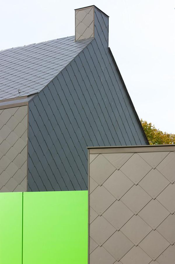 Les ardoises sont devenues une évidence car, si historiquement on les destinait à protéger les bâtiments de la pluie, il devenait naturel de les utiliser aujourd’hui dans un contexte énergétique spécifique pour se protéger du froid. Les ardoises, posées en losange, reflètent fidèlement les nuances et structures traditionnelles des constructions avoisinantes. L’argument économique a terminé de convaincre le client.