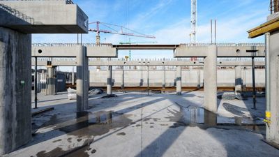 Le gros œuvre du complexe, d’une surface de plancher de 100.000 m² et d’une empreinte au sol de 34.000 m², est pratiquement en totalité constitué d’éléments préfabriqués. A cet effet 1700 colonnes, 1900 poutres, 62.000 m² de hourdis précontraints ainsi que 1150 panneaux de façade porteurs ont été fabriqués et posés en moins d’un an.
