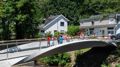 Ce projet est né à la suite des inondations de la Vesdre à Eupen en 2021, lorsque SEA+Partners a été mandaté pour réhabiliter sept ouvrages, dont quatre passerelles piétonnes. La géométrie générique des ponts a conduit au choix du béton préfabriqué avec un coffrage standard réutilisable, favorisant ainsi efficacité et durabilité. Ces passerelles, réalisées en béton armé avec des armatures en acier inoxydable, offrent une durabilité optimale, une géométrie contrôlée et un processus de fabrication strictement encadré.