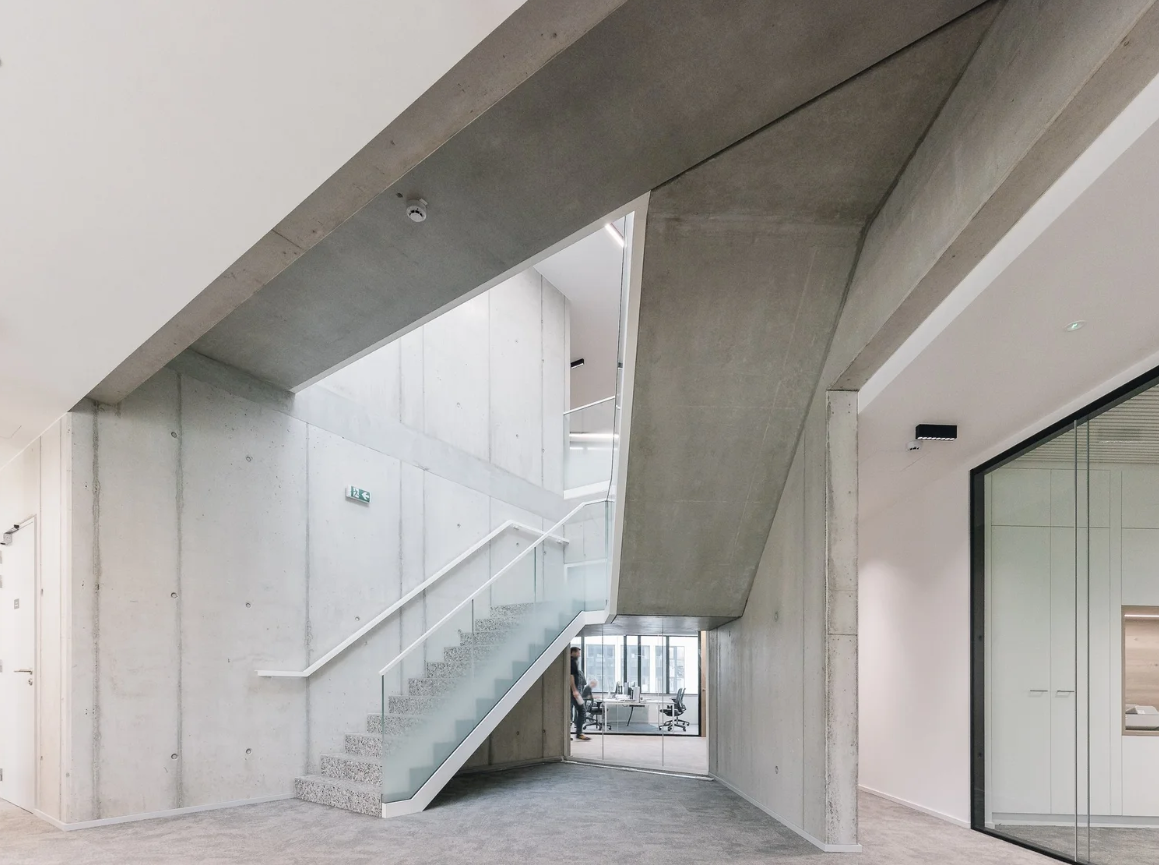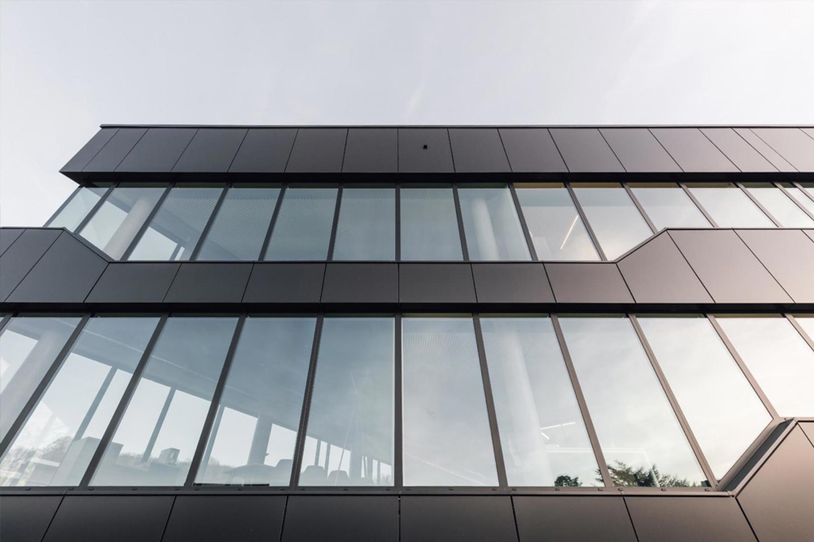 Le bâtiment se développe sur trois niveaux et présente une volumétrie linéaire le long de la rue. Il est réalisé majoritairement en béton, en cohérence avec le savoir-faire de l’entreprise, et complété par un bardage métallique de teinte foncée.