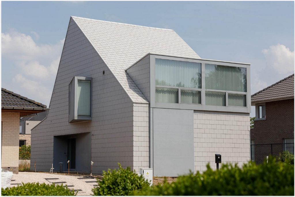 Contrairement aux maisons voisines, les architectes n’ont pas appliqué les prescriptions urbanistiques à la lettre. C’est seulement dans un second temps que le volume créé a été adapté pour rentrer dans les tolérances admises. Pour accentuer les contours particuliers, un bardage monochrome en ardoises gris béton a été choisi. Au départ, les architectes voulaient travailler avec des ardoises en losange pour la connotation de façade provisoire que ce motif semble éveiller chez le spectateur. Mais le maître d’ouvrage n’en a pas voulu, justement pour cette raison. Les architectes se tournent alors vers la pose à claire-voie qui n’a pas été retenue non plus parce qu’elle ne pouvait pas être appliquée sur le toit. Finalement, c’est la pose classique à recouvrement double qui a été retenue, pour l’esthétique uniforme et apaisante du motif.