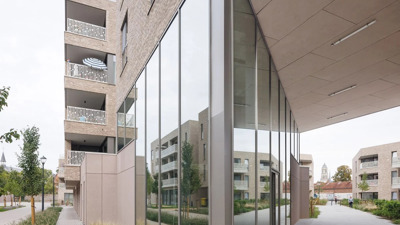 « Le projet résidentiel contemporain se compose de cinq entités et s’inspire des nombreux coins et places pittoresques de la ville », explique Bart Janssens. « Nous avons résolument choisi de créer une zone intérieure verte, durable et sans voitures, afin que les cyclistes et les promeneurs puissent en profiter en toute quiétude. Le lien avec le centre-ville et la verdure est tangible partout. Le projet relie les structures historiques des anciens remparts, le Kapucijnenvest et les remparts verts le long des maisons-dieu récemment restaurées. Depuis chaque terrasse, les résidents bénéficient d’une vue magnifique sur le jardin intérieur, les remparts ou la ville. L’axe de promenade diagonal à travers la place intérieure verte offre une traversabilité maximale et une belle vue sur l’église Saint Gommaire. »