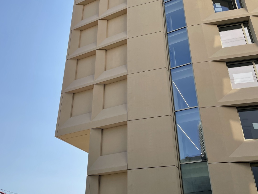 Les façades sont ainsi composées de deux types d’éléments produits en usine et livrés sur chantier par DECOMO : d’une part, sur les façades aveugles, de grands éléments rectangulaires porteurs, affichant des cartouches d’hiéroglyphes, et d’autre part, des éléments rapportés encadrant les fenêtres en façade ouest. Christophe Gobert : « Pour le bon déroulement du chantier, la priorité était de valider, sur base d’un prototype à l’échelle 1/1, et puis de lancer en fabrication tous les éléments porteurs pour nous permettre d’avancer suivant la rotation envisagée. »