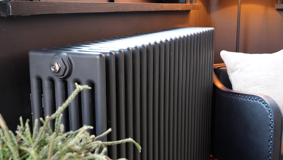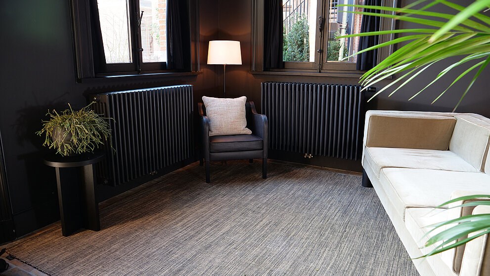 À l'hôtel August, des radiateurs Charleston noirs ont également été installés dans certaines zones. Ces radiateurs noirs créent une ambiance élégante et chaleureuse. Avec son design classique et sa finition noire élégante, le radiateur Charleston s'harmonise parfaitement avec le design moderne de la pièce.