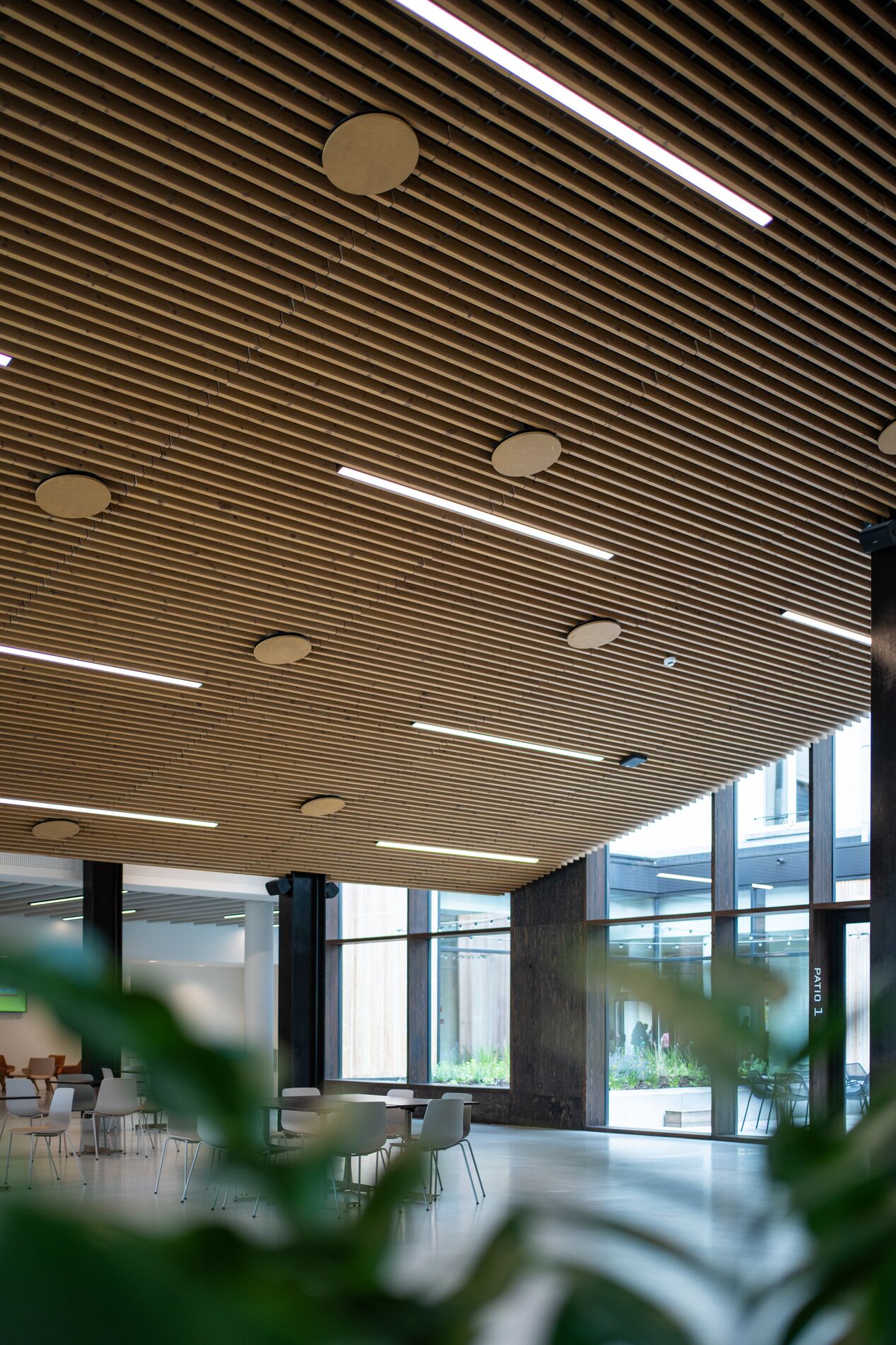 Hunter Douglas Architectural a fourni le plafond intérieur du campus, composé des lattes de bois massif fixés les unes aux autres par des tourillons en acier. Le plafond du gril a un caractère ouvert, ce qui signifie que le bruit ambiant est très bien absorbé lorsque des tapis isolants sont utilisés.