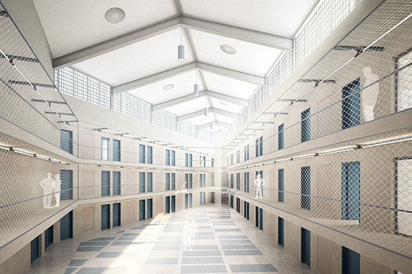 La structure portante des bâtiments se compose essentiellement d’éléments en béton préfabriqués. Ce procédé est justifié du point de vue économique, de la durabilité et de la qualité, et a permis la construction de la prison en un court laps de temps.