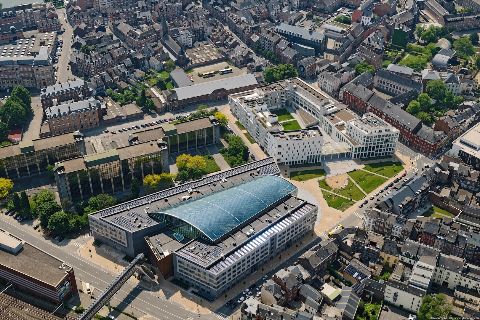 Le complexe se présente sous la forme d’un îlot dont la perspective principale est dirigée vers le parc urbain implanté dans l’axe du palais, assurant ainsi la connexion piétonne avec le centre-ville de Namur.