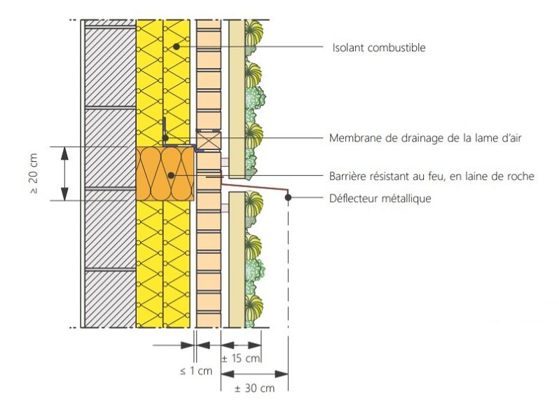 - installer des barrières ‘coupe-feu’ tous les deux niveaux ou au droit de chaque ouverture dans la façade. Ceci permet d’interrompre la végétation et l’éventuelle lame d’air continue située derrière la façade végétalisée (voir figure 1). Il peut s’agir d’un déflecteur réalisé au moyen d’une tôle en acier (pas en aluminium) d’au moins 1 mm d’épaisseur et fixé mécaniquement (voir figure 2). Un dépassement horizontal de 15 cm de la zone végétale est considéré comme sécuritaire. Ces barrières sont placées dans le prolongement de celles nécessaires pour interrompre l’isolation combustible des bâtiments moyens selon la réglementation actuelle (voir Les Dossiers du CSTC 2020/3.4, § 4.2.1)