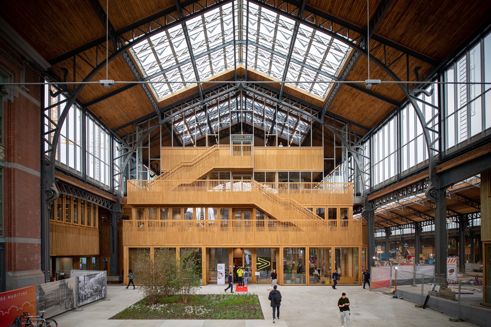 « Dans une deuxième phase, le bureau Neutelings Riedijk Architecten a été impliqué dans la conception des éléments intérieurs. La mission consistait à organiser les commerces et les bureaux à l’intérieur du site, mais à garder aussi suffisamment d’espace public disponible pour le quartier. Le hall existant a 100 ans et nous voulions qu’il perdure dans le temps. C'est pour cela que nous avons choisis des éléments intérieurs démontables avec une structure en CLT à côté des systèmes de murs-rideaux de Jansen by ods.