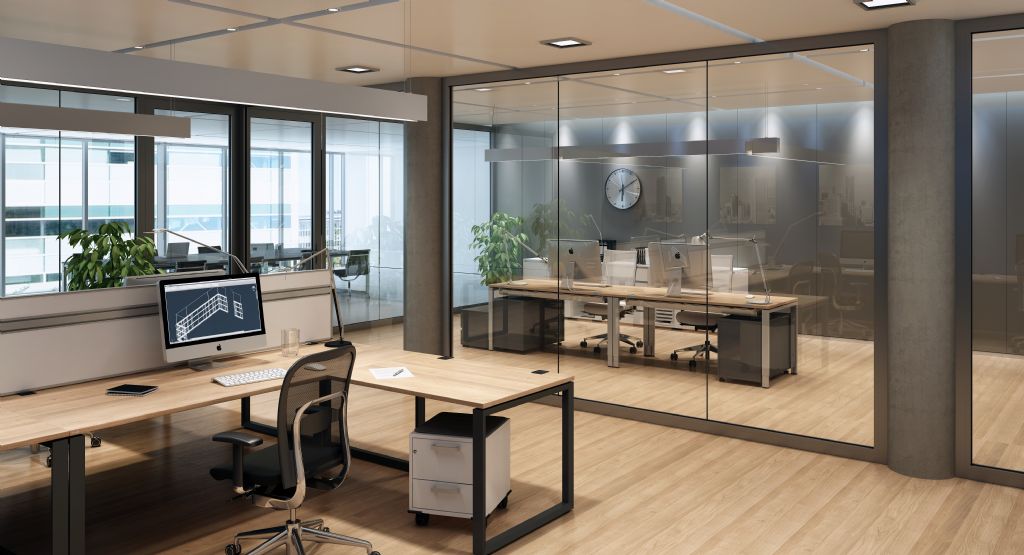 Cloison vitrée résistante au feu avec vitrage continu sans barrière visuelle sur l'ensemble des modules.