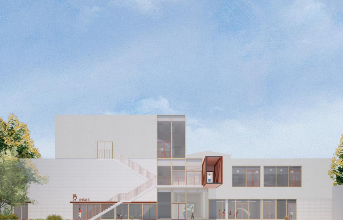 D’un point de vue architectural, le projet imaginé par le bureau d’architecture AgwA se veut minimaliste et sobre. Côté rue, la façade restera inchangée. Côté cour, une nouvelle façade blanche avec notamment un jeu de blocs de béton, un enduit sur isolant et des menuiseries en bois donneront une ambiance paisible et une nouvelle image à l’INSAS. La sobriété est voulue pour des raisons écologiques (récupérer au maximum l’existant), économiques (le budget est serré) et pédagogiques (les locaux créés seront bruts et modulables pour permettre divers usages).