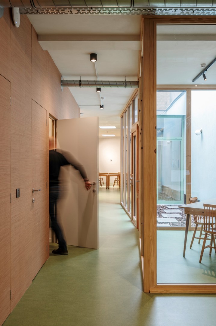 En outre, l'équipe de construction a réutilisé efficacement tous les matériaux qui pouvaient avoir une seconde vie sur le site. Par exemple, les équipements sanitaires, les appuis de fenêtre en marbre, les portes intérieures et les couches d'isolation en fibres de cellulose ont été conservés en état. Certains matériaux ont été remis à neuf, comme l'éclairage extérieur qui a été repeint, ou ont changé de place, comme la cuisine qui a été déplacée du bureau vers l'un des appartements.